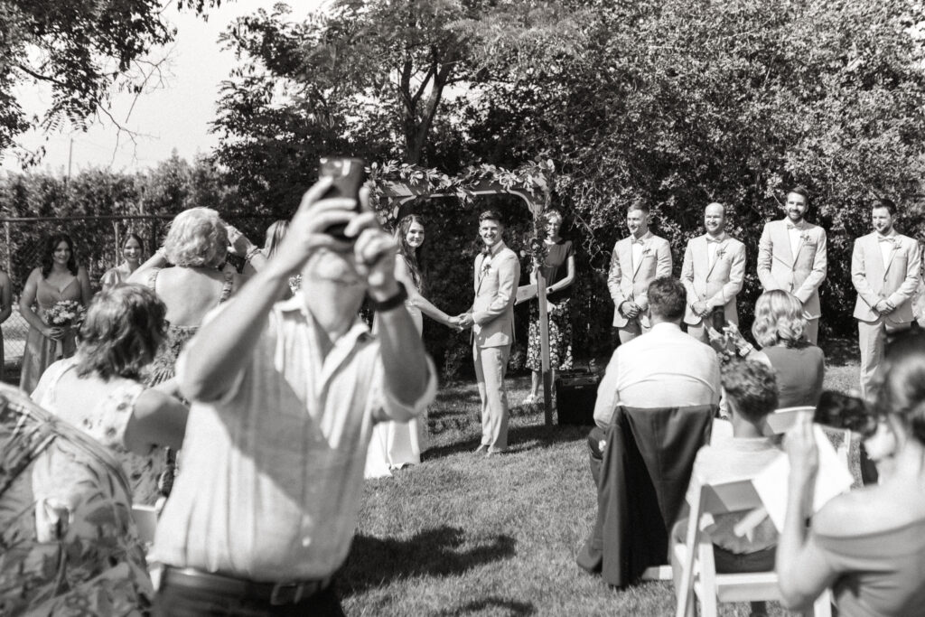 When you’re standing at the altar, consider asking your officiant to give guests a quick 30-second window to snap photos or videos of you both. Once the time is up, have the officiant invite everyone to put their phones away and fully immerse themselves in the ceremony.